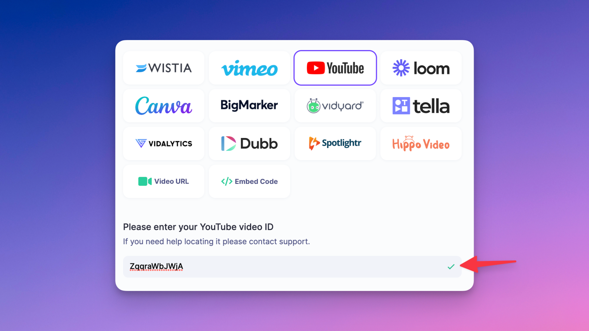 Now when you start typing the ID of the video, you'll notice a spinning icon to the right. If the video entered has been found and validated, it will turn to a green checkmark. If not, a red exclamation mark will be displayed along with a message.