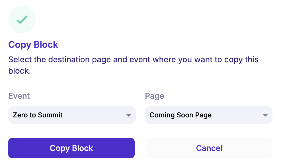 Reusing your best content just got a whole lot easier. We’ve added a new copy block feature to the page builder, making it simple to duplicate a block and place it exactly where you need it — even across different events.