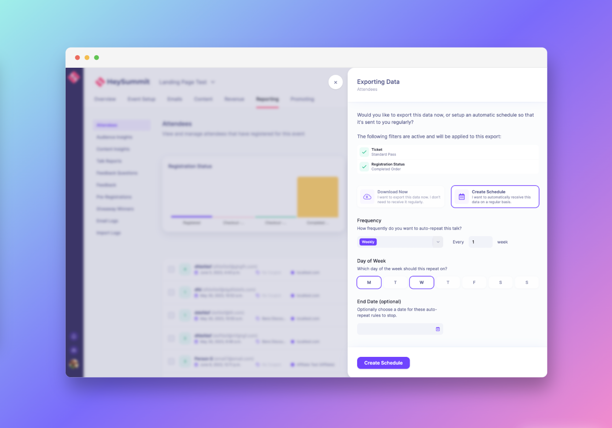 Due to popular demand, we've completely rebuilt our exporting capabilities within HeySummit. When exporting data, you can now choose to download the export immediately or create an export schedule.