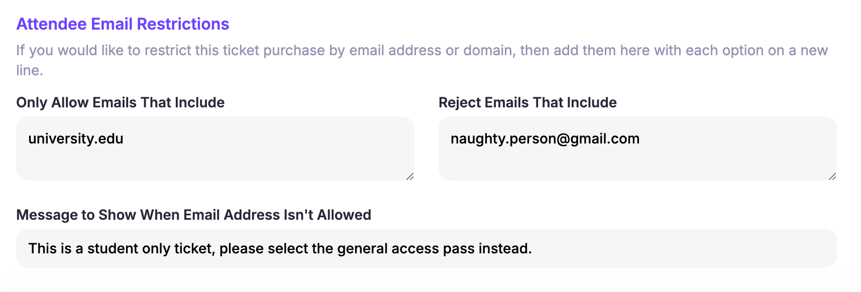 When email restrictions are in place, tickets, add-ons and donations will only be shown if the attendee’s email address matches your criteria. If the attendee hasn’t provided their email yet (depending on your checkout flow), all options will initially be displayed. Once an email is submitted, any restricted items in their cart will be flagged, and the attendee will be prompted to revise their selection before completing checkout.