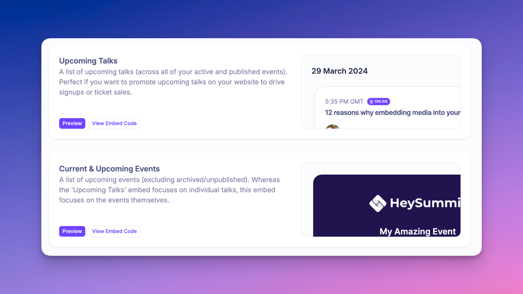 These updates are accessible through the "Promoting > Embeddable Media" section of your event dashboard. With these enhancements, you're equipped to provide a more dynamic and engaging experience for your website visitors, ensuring they have easy access to all your event information.