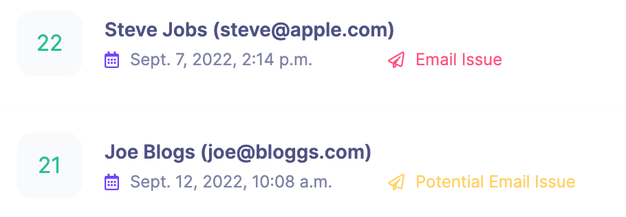On the other hand, a deliverability email highlighted in yellow indicates what is known as a soft bounce. This is when the recipients mail server reports back to us that there is a temporary issue with them receiving the email. This could indicate that their inbox is full or that there is a temporary network issue with their mail server. When this happens, we will continue to attempt to send future emails to that recipient.
