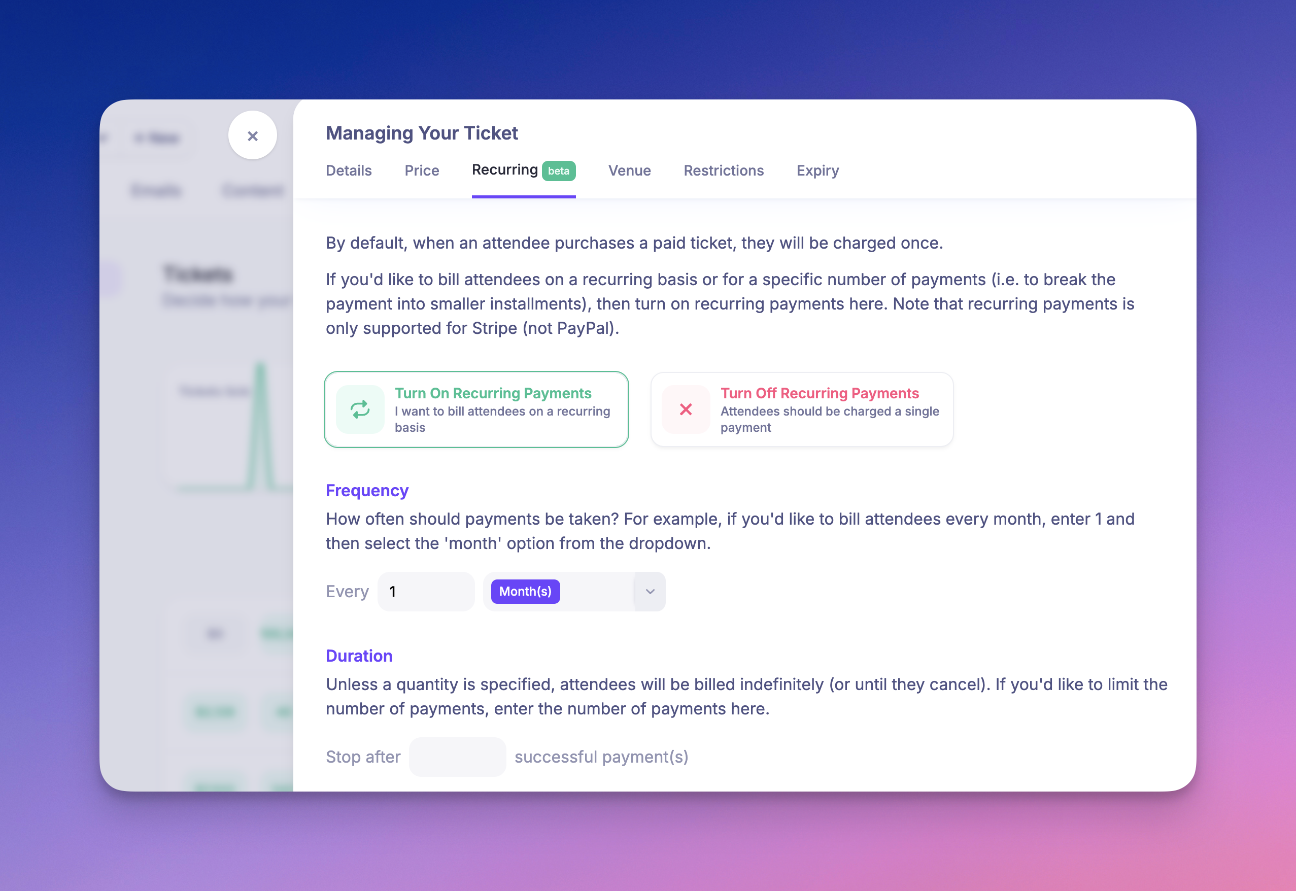 Set Payment Durations: Allow ongoing payments until attendees cancel, or define a fixed number of payments (e.g., 4 monthly instalments).