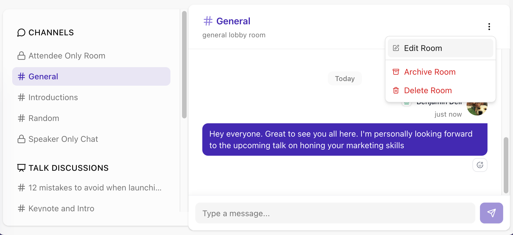Enable private 1:1 or group chats between attendees, speakers, and team members. Fully optional and off by default - you choose whether to turn it on.