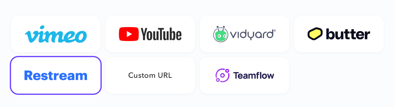 We now support using Restream as a custom stream provider for event talks. If you use Restream and want to embed a Restream stream when broadcasting a talk, you can now do this easily by selecting Restream when configuring your Custom Stream and then entering the ID of the Restream you want to embed.
