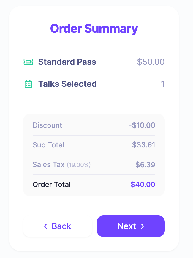 Once these new fields have been set, checkout summary (for attendees to see) will be updated to show the breakdown of the cost (pre tax, the tax amount and then the total amount including tax). In addition, we have updated the attendee purchase invoices to include this tax breakdown as well.