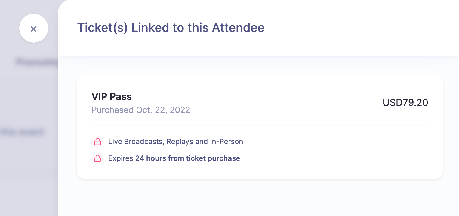 For times when you need to easily and quickly see exactly what an attendee has purchased, we've created a new area to do just that. On the Reporting > Attendees list, you'll see a new dropdown menu item next to each Attendee titled "View Tickets". This new view will show all tickets purchased by that attendee, as well as any restrictions linked to it (such as an expiry date).